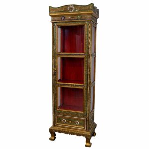 ตู้โชว์กระจกไม้ ตกแต่งลายรักสมุกแบบโบราณและทำสีแดงเก่า เหมาะสำหรับใช้ในบ้าน โรงแรม ร้านนวดสปา จะเป็นเอกลักษณะเฉพาะคุณ ใครผ่านเข้ามาก็ชื่นชม
